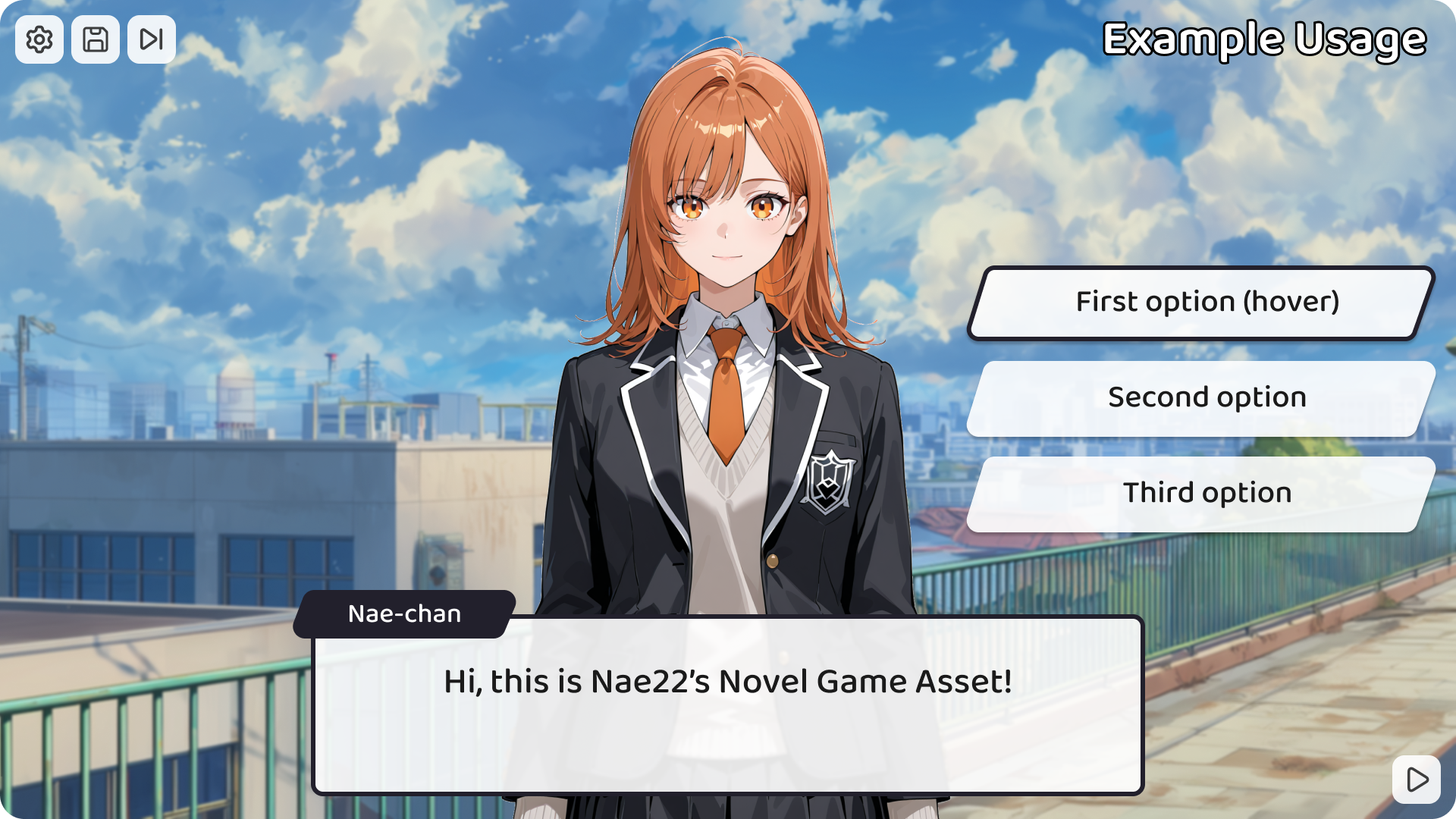 - 1 dialogue box, 2 choice buttons in 2 states: idle and hover, 4 game buttons: settings, save, skip, and continue
